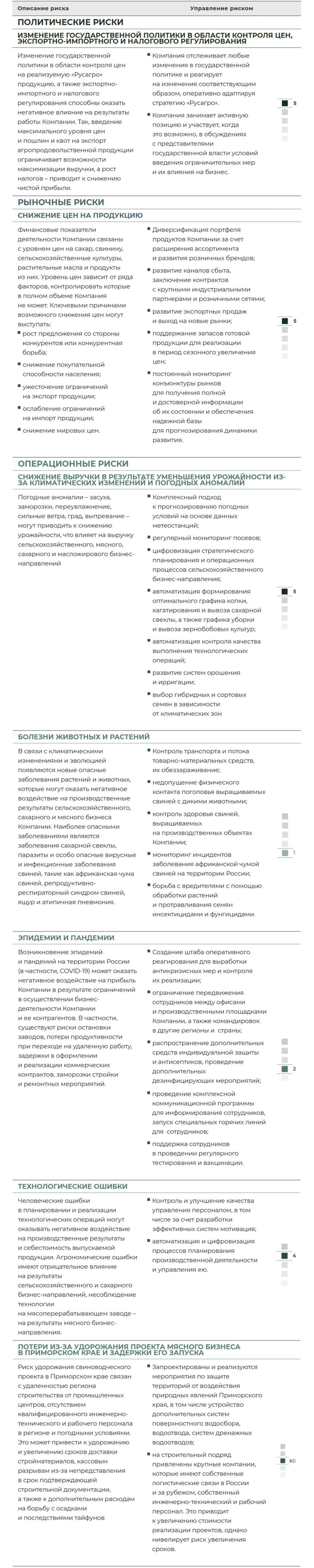 «Русагро» выделяет значительные ресурсы для идентификации, оценки и учета рисков в процессе принятия бизнес-решений. Компания стремится соответствовать национальным и международным стандартам риск-менеджмента: на постоянной основе осуществляет мониторинг рисков и актуализирует собственный инструментарий управления рисками с целью максимизации стоимости Компании и снижения потенциального негативного воздействия в случае их реализации. Компания выделяет семь основных видов рисков, влияние которых оказывает наибольшее влияние на результаты ее деятельности. В 2020 г. также была проведена оценка влияния пандемии COVID-19 на результаты Компании.
